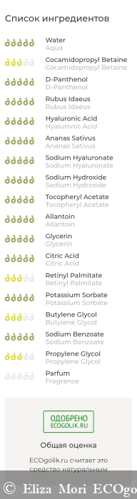 Aqua, Cocamidopropyl Betaine, D-Panthenol, Rubus Idaeus, Hyaluronic Acid, Ananas Sativus, Sodium Hyaluronate, Sodium Hydroxide, Tocopheryl Acetate, Allantoin, Glycerin, Citric Acid, Retinyl Palmitate, Potassium Sorbate, Butylene Glycol, Sodium Benzoate, Propylene Glycol, Fragrance