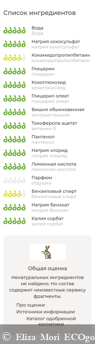 Вода, натрия кокосульфат (ПАВ из кокосового масла), кокамидопропилбетаин, глицерин, кокоглюкозид, глицерил олеат, экстракт вишни, витамин E, пантенол, натрия хлорид, лимонная кислота, отдушка, бензиловый спирт, натрия бензоат, калия сорбат, натуральный краситель кармин.