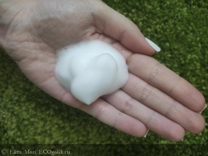 Пенка белая, плотная и нежная, похожа на лёгкое воздушное облачко. Она не исчезает мгновенно, а мягко распределяется по коже, хорошо очищает и легко смывается водой.😇🙂