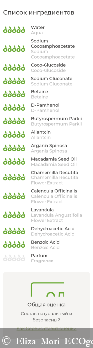 Aqua, Sodium Cocoamphoacetate, Coco-Glucoside, Sodium Gluconate, Betaine, D-Panthenol, Butyrospermum Parkii, Allantoin, Argania Spinosa, Macadamia Seed Oil, Chamomilla Recutita (Matricaria) Flower Extract , Calendula Officinalis Flower Extract, Lavandula Angustifolia (Lavender) Flower Extract, Dehydroacetic Acid, Benzoic Acid, Fragrance* (пищевая отдушка с гипоаалергенным статусом)