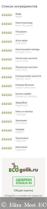 Aqua, Coco-Glucoside, Glycerin, Aloe Barbadensis Leaf Juice, Xanthan Gum, Lactic Acid, Citric acid, Salicylic Acid, Sodium Benzoate, Potassium sorbate, Hypericum Perforatum Extract, Tussilago Farfara Extract, Echinacea Angustifolia Extract, Bidens Tripartita Extract, alpha-Terpineol, Magnolia Officinalis Bark Extract.