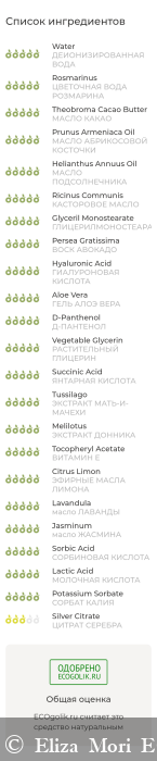 ДЕИОНИЗИРОВАННАЯ ВОДА • ЦВЕТОЧНАЯ ВОДА РОЗМАРИНА • МАСЛО КАКАО • МАСЛО АБРИКОСОВОЙ КОСТОЧКИ • МАСЛО ПОДСОЛНЕЧНИКА • КАСТОРОВОЕ МАСЛО • ГЛИЦЕРИЛМОНОСТЕАРАТ • ВОСК АВОКАДО • ГИАЛУРОНОВАЯ КИСЛОТА (ВЫСОКО- И НИЗКОМОЛЕКУЛЯРНАЯ) • ГЕЛЬ АЛОЭ ВЕРА • Д-ПАНТЕНОЛ • РАСТИТЕЛЬНЫЙ ГЛИЦЕРИН • ЯНТАРНАЯ КИСЛОТА • ЭКСТРАКТ МАТЬ-И-МАЧЕХИ • ЭКСТРАКТ ДОННИКА • ВИТАМИН Е • ЭФИРНЫЕ МАСЛА ЛИМОНА • ЛАВАНДЫ И ЖАСМИНА • СОРБИНОВАЯ КИСЛОТА • МОЛОЧНАЯ КИСЛОТА • СОРБАТ КАЛИЯ • ЦИТРАТ СЕРЕБРА