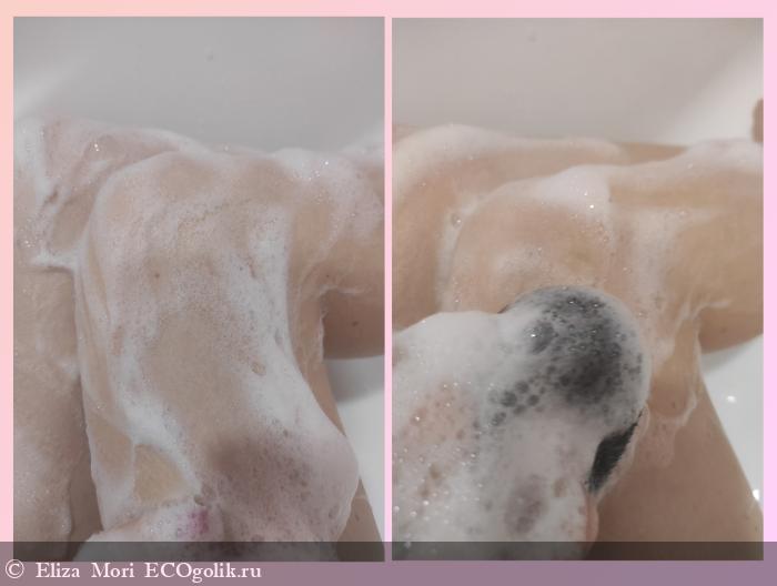 Гель имеет плотную, но лёгкую текстуру — он не стекает с ладоней, прекрасно распределяется по коже и образует воздушную пену.