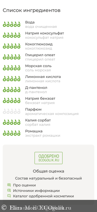 вода очищенная, кокосульфат и кокоглюкозид (натуральные пенные компоненты из растительного сырья), глицерил олеат (натуральный иммуностимулятор кожи), соль морская, лимонная кислота, д-пантенол (провитамин В5), бензоат натрия (пищевой консервант для натуральной косметики), ароматическая композиция, сорбат калия (пищевой консервант для натуральной косметики), экстракт ромашки.