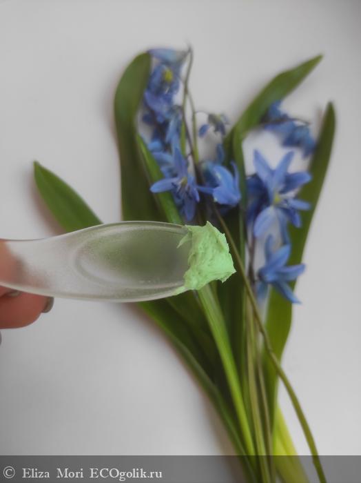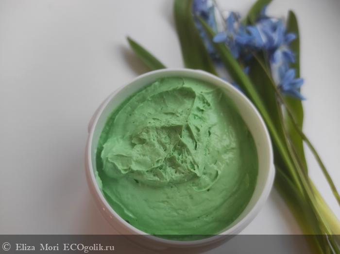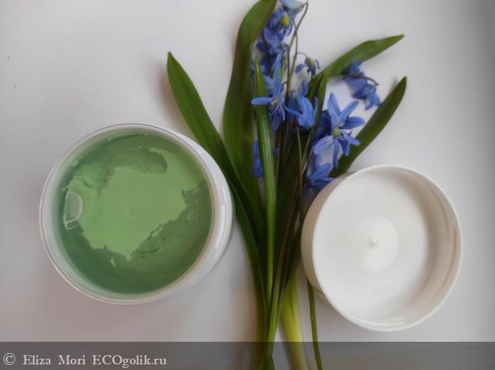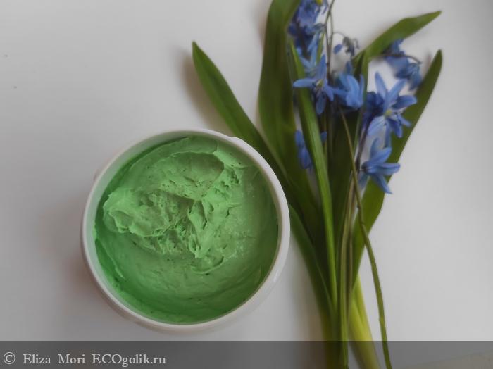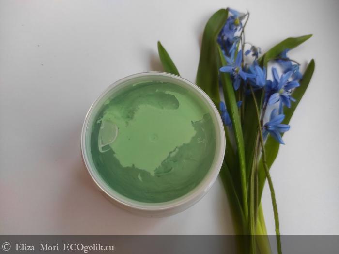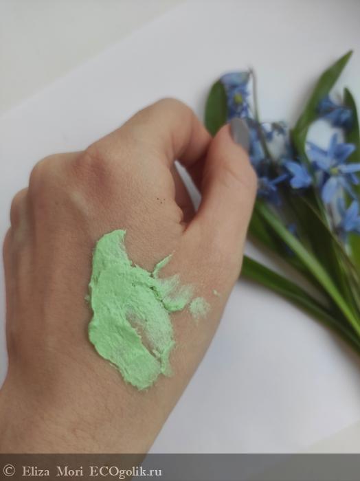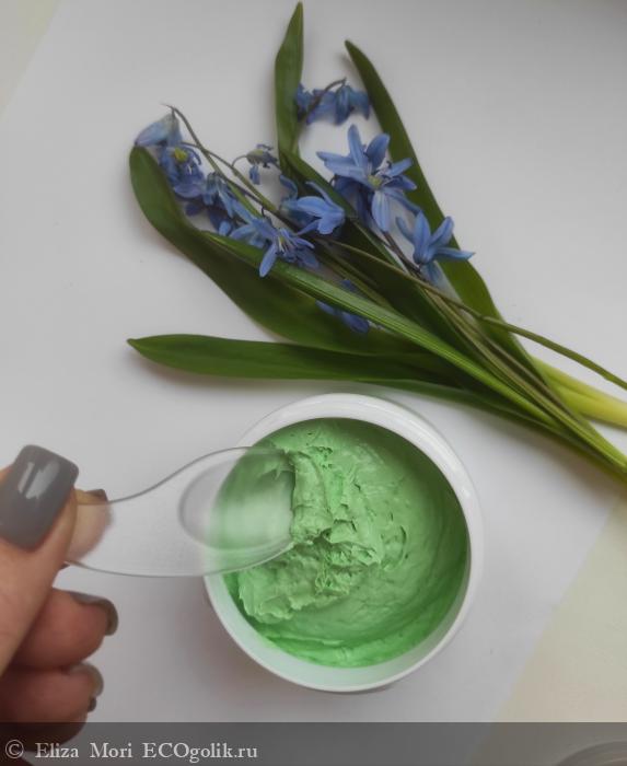 Цвет маски — насыщенный, сочный зелёный. Оттенок свежий, натуральный, напоминает цвет молодых листьев или целебных трав. Такой оттенок вызывает ассоциации с природой и уходом, подчёркивая натуральный состав и успокаивающий эффект маски.