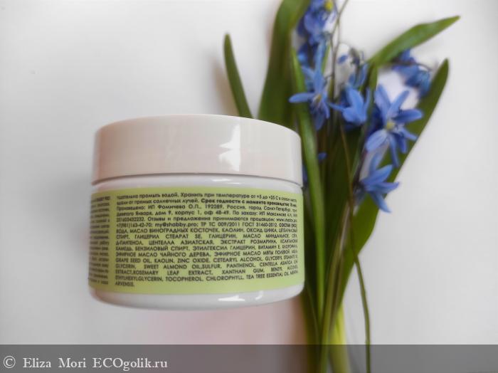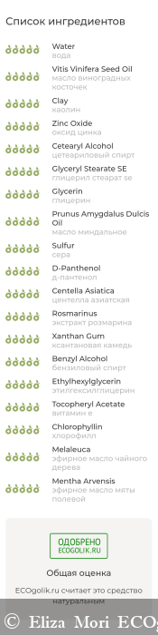 Состав: вода, масло виноградных косточек, каолин, оксид цинка, цетеариловый спирт, глицерил стеарат se, глицерин, масло миндальное, сера, д-пантенол, центелла азиатская, экстракт розмарина, ксантановая камедь, бензиловый спирт, этилгексилглицерин, витамин е, хлорофилл, эфирное масло чайного дерева, эфирное масло мяты полевой.