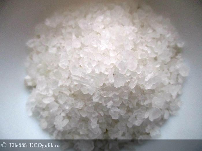 Соль имеет крупный помол. По цвету соль никак не выделяется: у нее светлый прозрачно-белый оттенок типичный для натуральной морской соли.