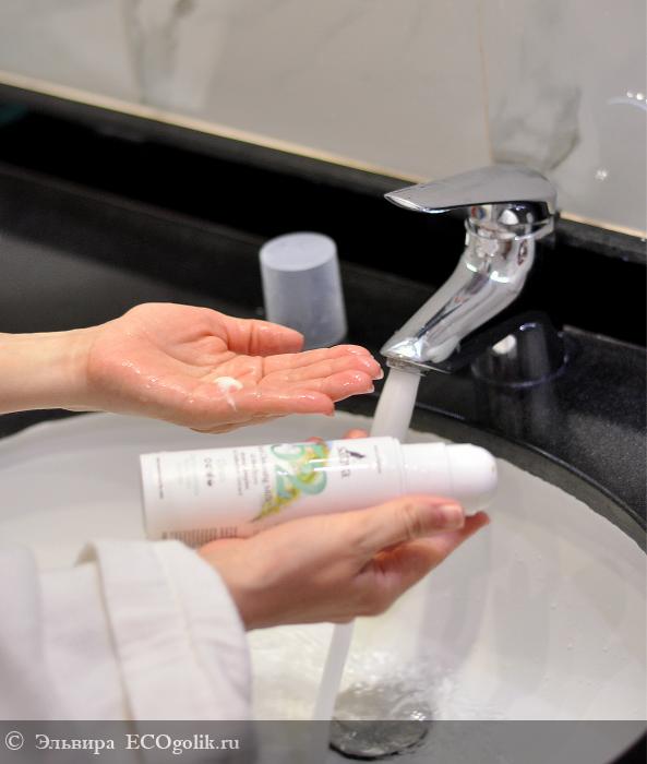 Мой способ применения: выдавить молочко в ладонь, мне хватает двух неполных нажатий, нанести на влажную кожу и помассировать ее, смыть водой.