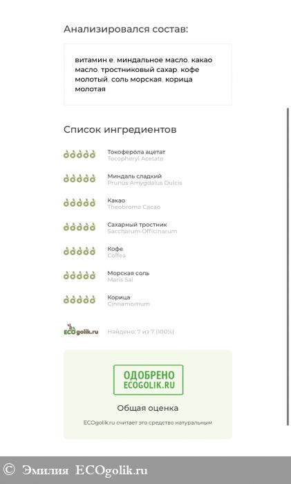 витамин е, миндальное масло, какао масло, тростниковый сахар, кофе молотый, соль морская, корица молотая