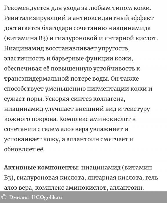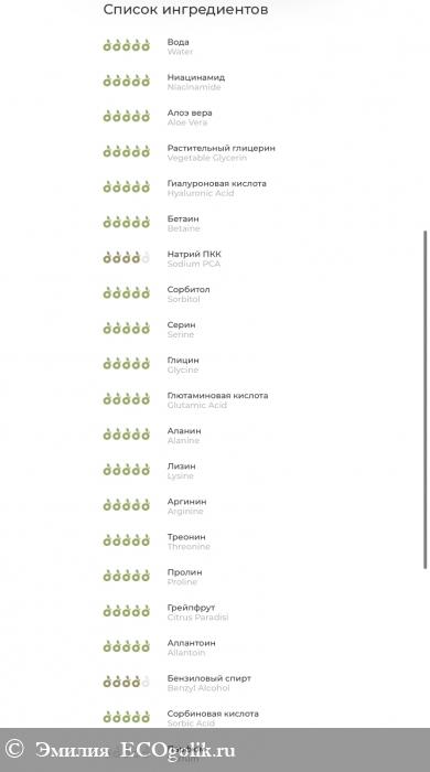 вода дистиллированная, ниацинамид (витамин B3), гель алоэ вера, глицерин растительный, гиалуроновая кислота, бетаин, натрий ПКК, сорбитол, комплекс аминокислот: серин, глицин, глутаминовая кислота, аланин, лизин, аргинин, треонин, пролин; экстракт грейпфрута, аллантоин, бензиловый спирт, кислоты янтарная, сорбиновая, дегидроуксусная, парфюмерная композиция.