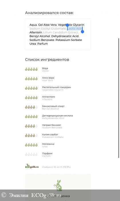 Aqua (Deionized), Gel Aloe Vera (гель алоэ вера), Vegetable Glycerin, Sodium Cocoyl Glutomate, Laсtic Acid (молочная кислота), Allantoin, Lilium Candidum (Madonna Lily) Extraсt (экстракт белой лилии), Benzyl Alcohol, Dehydroacetic Acid, Sodium Benzoate, Potassium Sorbate, Urea, Parfum.