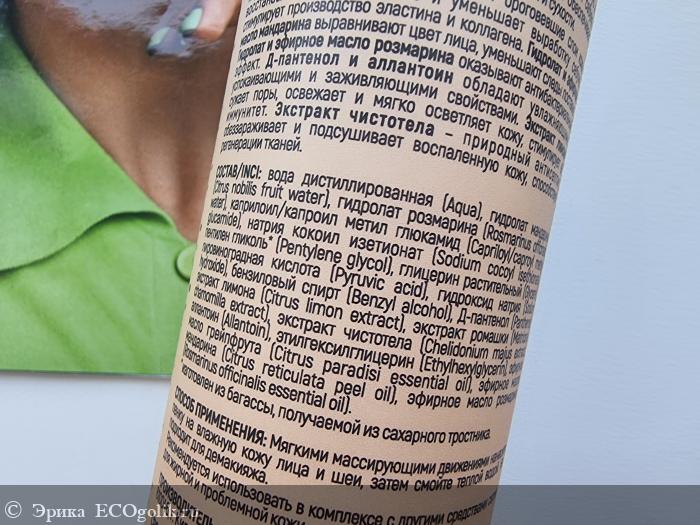 В пенке главные роли отведены пировиноградной кислоте, гидролату и маслу мандарина, гидролату розмарина, экстракту лимона, чистотела, пантенолу и аллантоину.