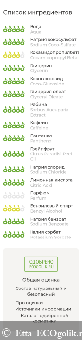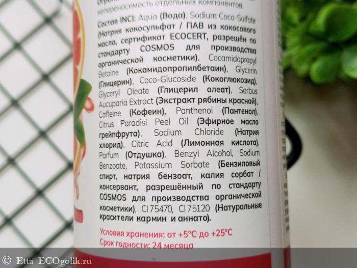 Aqua (Вода), Sodium Coco-Sulfate (Натрия кокосульфат / ПАВ из кокосового масла, сертификат ECOCERT, разрешён по стандарту COSMOS для производства органической косметики), Cocamidopropyl Betaine (Кокамидопропилбетаин), Glycerin (Глицерин), Coco-Glucoside (Кокоглюкозид),Glyceryl Oleate (Глицерил олеат), Sorbus Aucuparia Extract (Экстракт рябины красной), Caffeine (Кофеин), Panthenol (Пантенол), Citrus Paradisi Peel Oil (Эфирное масло грейпфрута), Sodium Chloride (Натрия хлорид), Citric Acid (Лимонная кислота), Parfum (Отдушка), Benzyl Alcohol, Sodium Benzoate, Potassium Sorbate (Бензиловый спирт, натрия бензоат, калия сорбат / консервант, разрешённый по стандарту COSMOS для производства органической косметики).