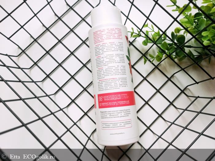 Гель для душа от бренда Индекс Натуральности упакован в пластиковую бутылку, довольно удобной формы. Бутылка устойчивая, я храню гели для душа на краю ванны, и они оттуда не падают. Дизайн похож на другие гели у бренда, но в случае с тонизирующей версией, лицевая этикетка более яркая и "аппетитная", каждое утро рука тянется к этой бутылочке в душе. На задней стороне представлена полная информация о геле: состав, краткая информация про активы и т.д.; а также есть информация о производителе. К слову, производится гель в Московской области.