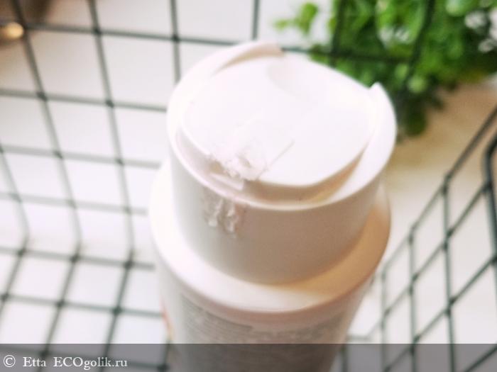 Дозатор выполнен в формате крышки диск-топ. Открывается и закрывается легко, сам дозатор не забивается остатками средства. Изначально он был закрыт на стикер, который защищает упаковку от несанкционированного вскрытия, и вот, он очень коряво отклеился, и теперь остатки стикера смотрятся не очень красиво. Но на функционал это не влияет. Стикер можно просто снять, не разрывая, но мне лень.