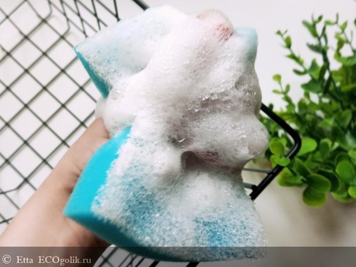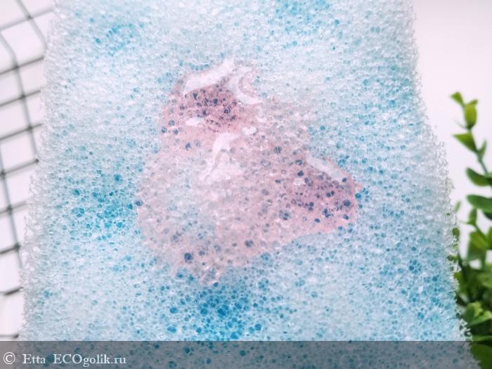 По цвету гель розовый, но при этом он прозрачный. Губку не окрашивает, и это уже хорошо. Значит красителей тут не очень много.