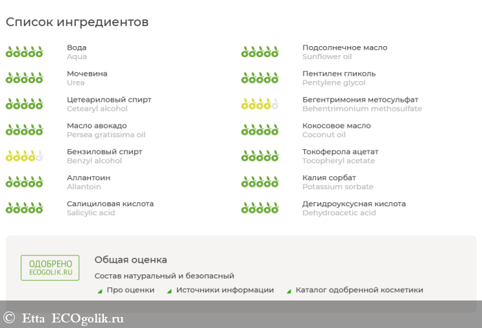 Aqua (вода дистиллированная), Sunflower oil (масло подсолнечника), Urea (мочевина), Pentylene glycol* (пентилен гликоль), Cetearyl alcohol (цетилстеариловый спирт), Behentrimonium methosulfate** (эмульгатор BTMS), Persea gratissima (avocado) oil (масло авокадо), Coconut oil (масло кокосовое), Benzyl alcohol (бензиловый спирт), Tocopheryl acetate (витамин Е), Allantoin (аллантоин), Potassium sorbate (сорбат калия), Salicylic acid (салициловая кислота), Dehydroacetic acid (дегидроуксусная кислота). * изготовлен из багассы, получаемой из сахарного тростника. ** катионный эмульгатор растительного происхождения.