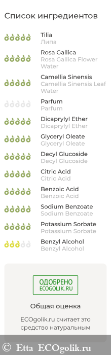 Экоголик одобрил состав, но изначально не смог определить гидролат липы, а именно Vulgaris Flower Water, поэтому я при проверке состава просто указала наименование растения Липа (Tilia).