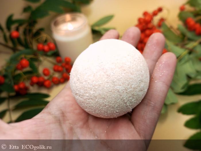 Бомбочка среднего размера, отлично спресованная, практически не осыпается при доставании из упаковки. Аромат очень интересный - я слышу что-то нежное, пудровое с небольшой смолистой ноткой и ягодной кислинкой. Цвет бомбочки нежно-розовый.