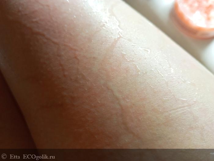 Сцепление скраба с кожей идеальное, на дно ванны он практически не осыпается. Скраб ировать бёдра минуты 3-4? Без проблем! Соль не успевает раствориться.