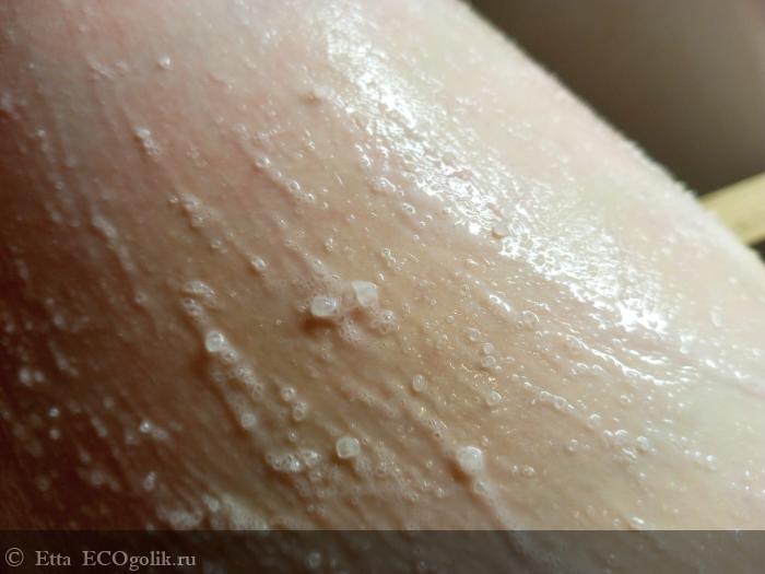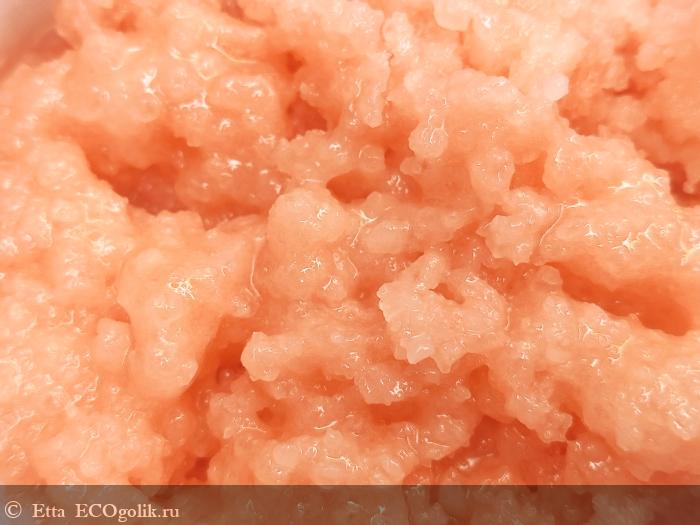 Текстура скраба может напугать "новичков", но я могу сказать, что он хоть довольно жёсткий (а я такие скрабы обожаю) и с очень крупными кристаллами соли, но они круглые, и кожу совершенно не царапают.