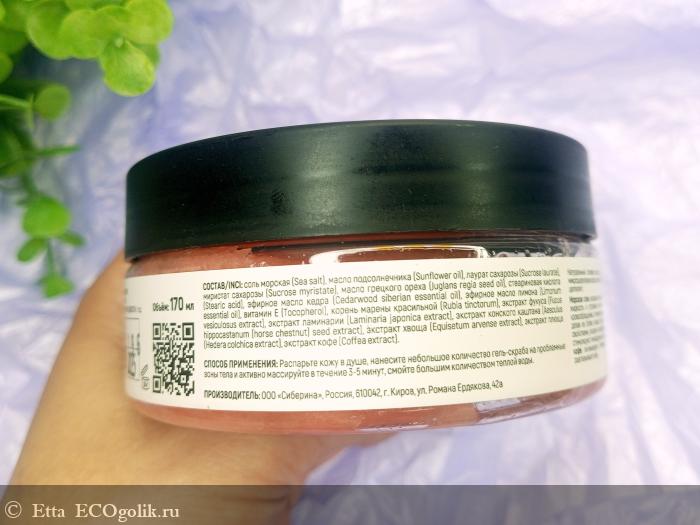 Sea salt (соль морская), Sunflower oil (масло подсолнечника), Sucrose laurate (лаурат сахарозы), Sucrose myristate (миристат сахарозы), Juglans regia seed oil (масло грецкого ореха), Stearic acid (стеариновая кислота), Cedarwood siberian essential oil (эфирное масло кедра), Limonum essential oil (эфирное масло лимона), Tocopheryl acetate (витамин Е), Rubia tinctorum (корень марены красильной), Fucus vesiculosus extract (экстракт фукуса), Laminaria japonica extract (экстракт ламинарии), Aesculus hippocastanum (horse chestnut) seed extract (экстракт конского каштана), Equisetum arvense extract (экстракт хвоща), Hedera colchica extract (экстракт плюща), Coffea extract (экстракт кофе).