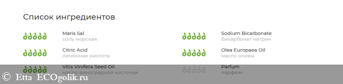 соль морская, бикарбонат натрия, лимонная кислота, масло оливы, масло виноградной косточки, парфюм, пищевой краситель