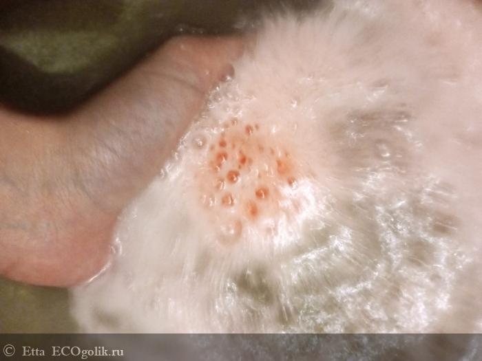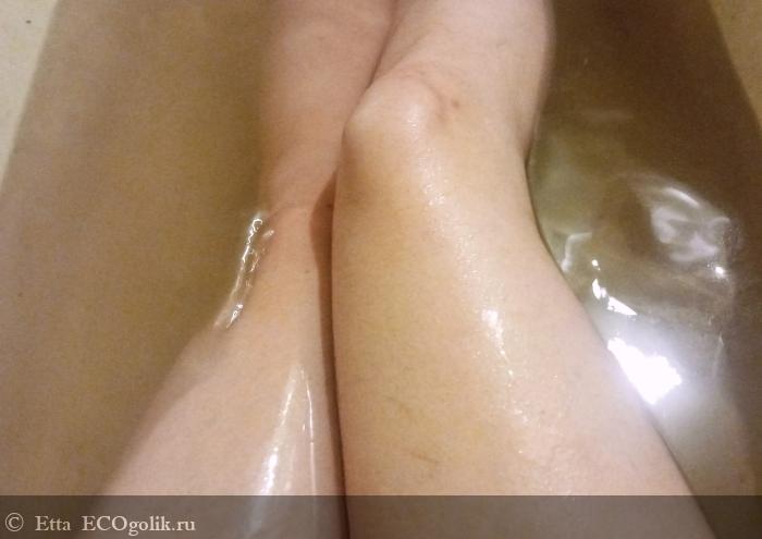Вода окрашивается в нежно-розовый цвет с легким молочным оттенком. Моя камера не может достоверно передать этот очень приятный оттенок воды, так как в тот момент освещение в ванной было теплого спектра, и все вокруг слегка отливало желтоватым оттенком.