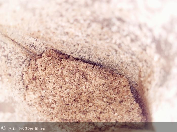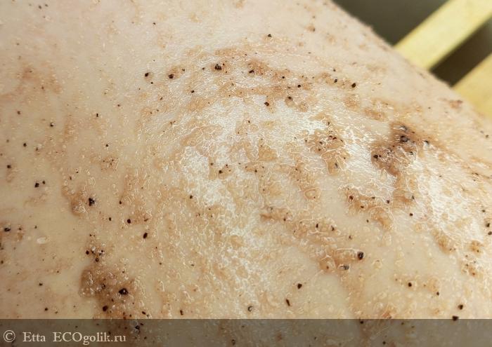 Скраб сухой, но масла в нем ощущаются. Сцепление с влажной, распаренной кожей мне понравилось, скраб отлично распределяется по коже, и не осыпается в ванную. Также за счет текстуры продукта очень удобно контролировать расход продукта.