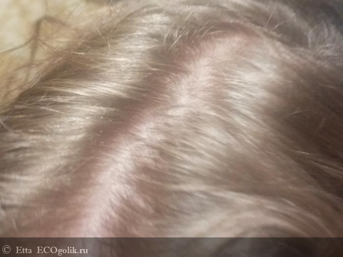 Я сначала подогревала масло отдельно, потом просто держала флакон под водой, но как показала практика, эффективность при применении масла комнатной температуры не изменяется. И наносить я стала сразу из дозатора на проборы, массируя потом корни волос. На всю длину масло мне особо не подходит, так как я кудрявая от природы, а масла сильно выпрямляют завиток, и смотрится это некрасиво. Шапочку для волос надеваю минут на 20, потом еще минут 10 массирую кожу головы. Полотенцем не утепляю, так как тогда мне становится не очень хорошо. Как масло выглядит на корнях показываю ниже.