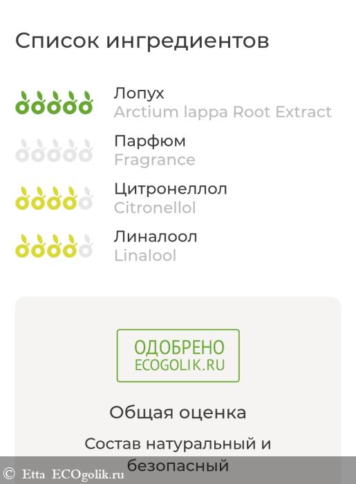 Сервис Экоголик на 100% одобрил только само масло репейника, остальные компоненты могут вызвать аллергические реакции (но у меня всё нормально), однако они разрешены в изготовлении натуральной косметики. Также для меня стало сюрпризом, что масло лопуха обладает антибактериальным свойством, а благодаря подписке Plus я ещё узнала, что репейное масло работает как средство от перхоти. Но для меня было актуально только свойство от выпадения волос.