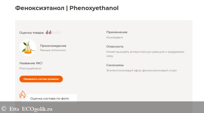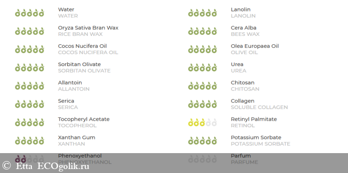 Состав у этого крема ПОЧТИ натуральный. Почти потому что в списке ингредиентов имеется феноксиэтанол, который экоголик оценил на 2 яблочка из 5. Но хочу отметить, что моя кожа реагирует на этот консервант нормально.
