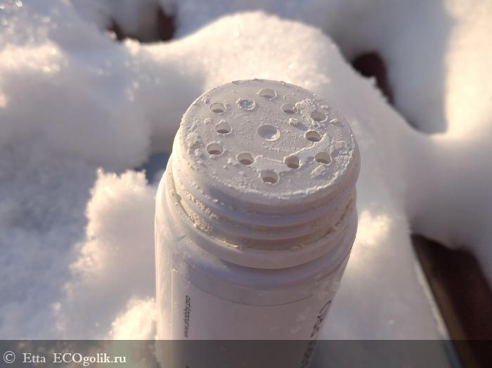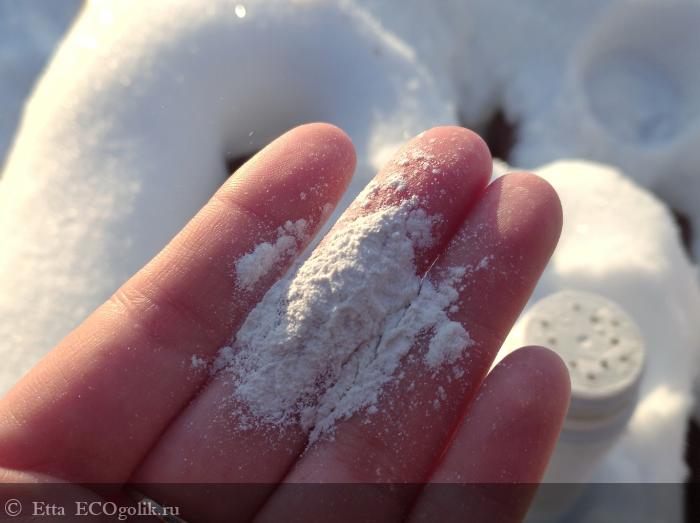 Прошу прощения за тавтологию, но пудра выглядит как пудра. Это белый порошочек очень мелкого помола, который практически ничем не пахнет.