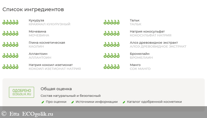 Порадовало то, что Экоголик оценил каждый компонент на пятерку по пятибалльной шкале натуральности.
