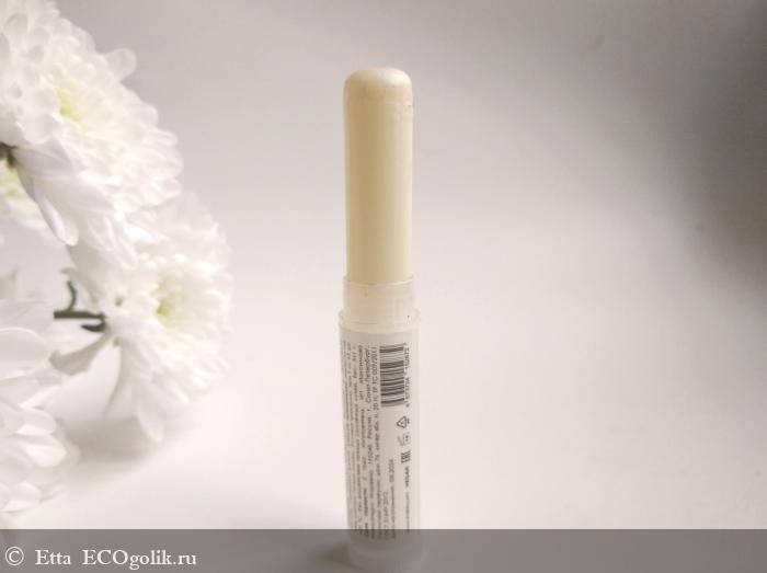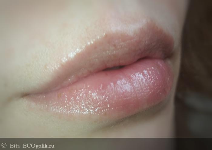 На фото можно углядеть лёгкий розоватый ободок, но это я просто намазалась бальзамом, забыв что у меня тинт на губах был. Но сам бальзам не окрасился, "крошка" от тинта легко снялась со стика подушечкой пальца.