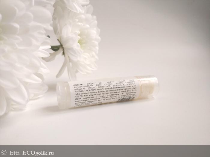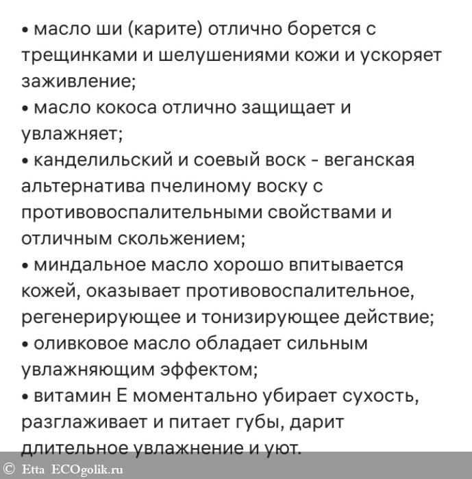 - Формула, на мой взгляд, разработана просто идеально. Иногда, когда кокосовое масло преобладает над остальными маслами, при длительном использовании бальзамов губы, наоборот, сохнут. Такая моя реакция на масло кокоса. С этим бальзамом проблем не возникло.