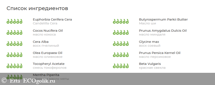 Мне нравится то, что все витамины - входящие в состав масел, так как допустим, я избегаю продуктов для губ с отдельно добавленным витамином А. Итак, что мы имеем? Бальзам "Персик+Мята" основан на натуральных маслах и восках. За охлаждающий спецэффект отвечает эфирное масло мяты. Также среди компонентов есть необычный - органическая композиция молекул персика.