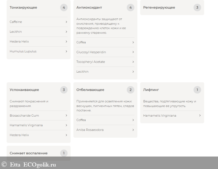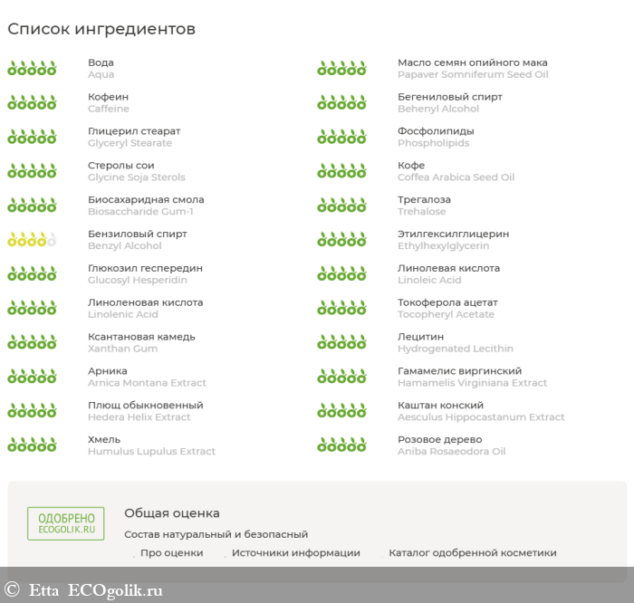 и очень интересный, так как помимо классических компонентов +/- привычных для в средствах для кожи вокруг глаз (конский каштан, кофе) есть ещё и необычные активы (масло маковых семян, экстракт арники и гесперидин). Давайте посмотрим, что о составе думает Экоголик?