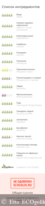Скажу сразу, что практически все компоненты - натуральные, но есть консервант феноксиэтанол, на который ругается экоголик. Мол, происхождение у него может быть разным, да и аллергию вызвать может. По собственному опыту скажу, что натуральные экстракты/гидролаты также могут вызвать аллергию, и причём чаще, чем синтетика. Тут уже путём проб и ошибок.