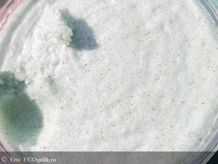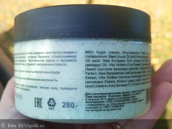 Внешне скраб очень красивый, лично мне он напоминает десерт или даже мятное мороженое, но самая фишка этого скраба заключается в его АРОМАТЕ. Он просто восхитительный! Квинтэссенция блаженства и заряд хорошего настроения с ним обеспечены! Скраб ярко пахнет белым виноградом и одновременно совершенно не химозной виноградной конфетой. Аромат окутывает и будто мягко обнимает в ванной, а после душа он сохраняется на коже тела еще где-то на час. Заряжает настроение, дарит комфорт и очень нравится противоположному полу.