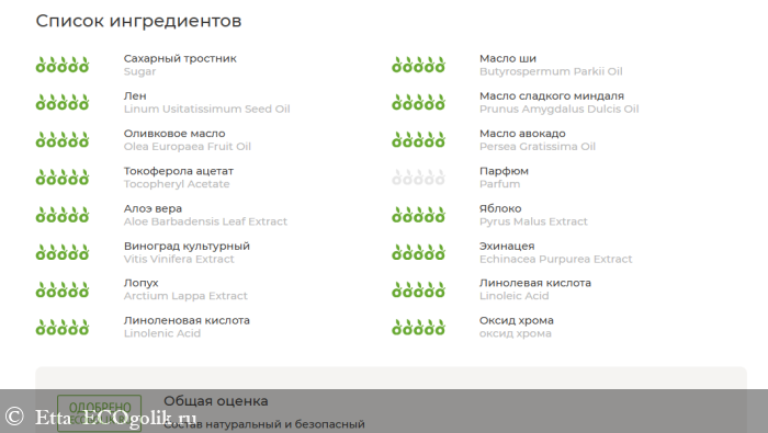 Sugar (сахар), Butyrospermum Parkii (ши) Oil (and) Linum Usitatissimum Seed (льна) Oil (and) Prunus Amygdalus Dulcis (миндаля) Oil (and) Olea Europaea Fruit (оливы) Oil (and) Persea Gratissima (авокадо) Oil, Vitis Vinifera (Fruit Powder) (сок винограда), Vitis Vinifera (Seed) (косточка винограда молотая), Tocopheryl Acetate (витамин Е), Parfum, Aloe Barbadensis Leaf (алоэ вера) Extract, Pyrus Malus (яблока) Extract, Vitis Vinifera (косточки винограда) Extract, Echinacea Purpurea (эхинацеи) Extract, Arctium Lappa (корня лопуха) Extract, Linoleic Acid (and) Linolenic Acid (витамин F), Chromium Oxide Green (оксид хрома).
