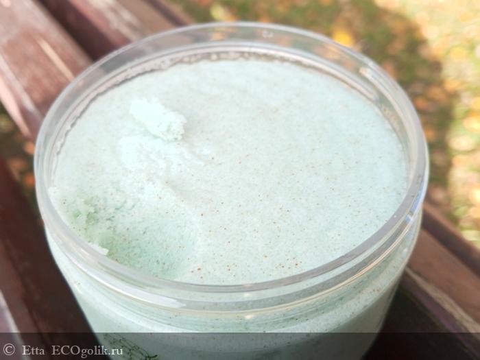 Скраб упакован в банку-шайбу из прочного пластика. На мой взгляд, это самый удобный формат упаковки для подобных продуктов. Дизайн стильный, на крышке представлена основная инфа о скрабе, а уже более подробно о нем, и о производителе - на боковых сторонах баночки.