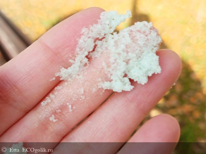 По текстуре скраб средней плотности, но при набирании его в ладонь излишней маслянистости не ощущается. Скрабирующих частиц много, они будто утоплены во взбитом масле. Частички пудры виноградной косточки мелкие, кожу не царапают.