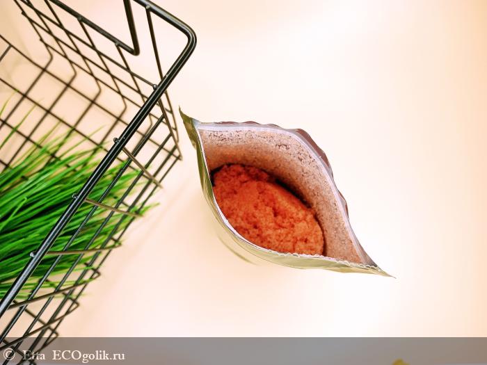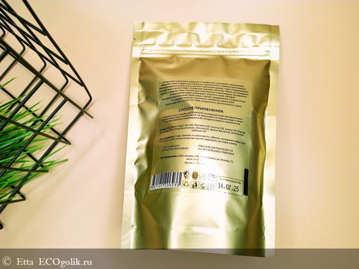 Скраб для тела упакован в классический дой-пак пакет, фольгированный изнутри. Дизайн упаковки минималистичный, но очень стильный. На обороте представлена вся необходимая информация как о самом скрабе, так и о его производителе.