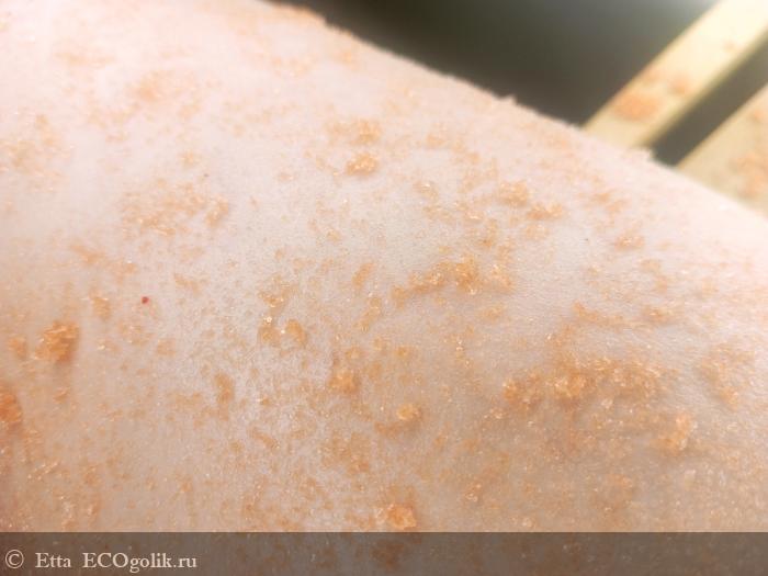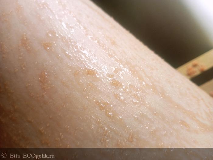 Массаж с ним очень приятный, скрабирование довольно ощутимое, но крупицы соли и сахара не травмируют кожу. После 3-5 минут массажа я оставляю скраб на коже еще на несколько минут, чтобы масла подействовали на кожу.