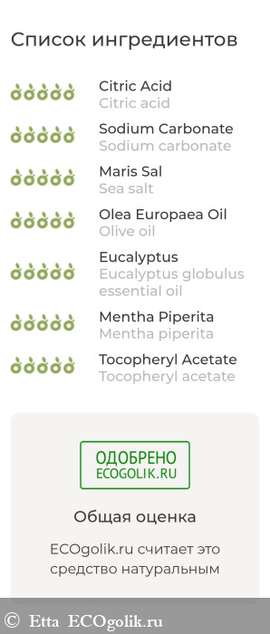 Citric acid (лимонная кислота), Sodium carbonate (карбонат натрия), Sea salt (соль морская), Olive oil (масло оливковое), Mentha piperita (peppermint) essential oil (эфирное масло мяты), Eucalyptus globulus essential oil (эфирное масло эвкалипта), Mentha piperita (листья мяты), Tocopheryl acetate (витамин Е).