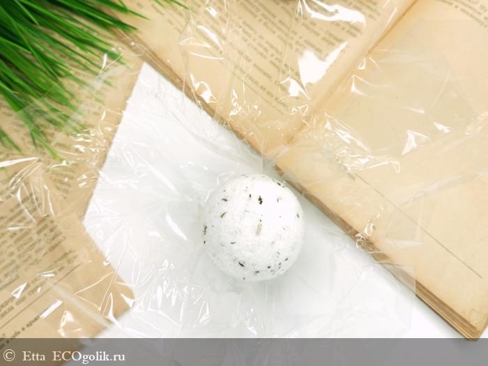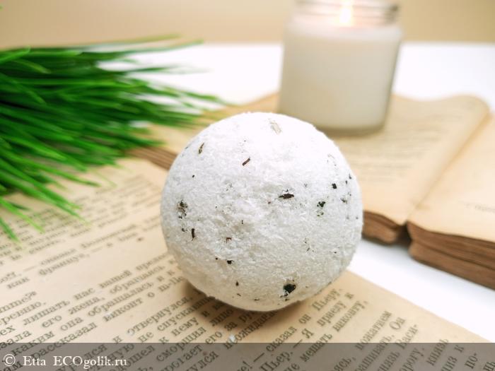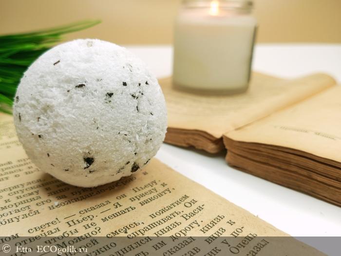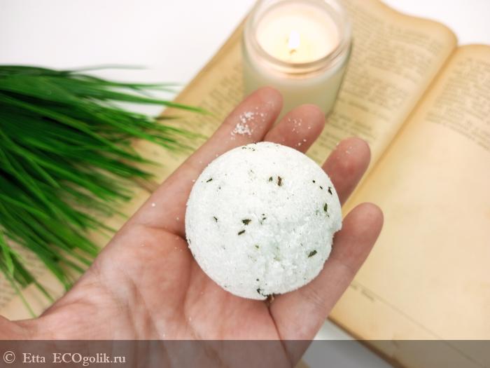 Также, помимо эфирного масла мяты в составе бомбочки есть мелко нарезанные высушенные листья мяты.