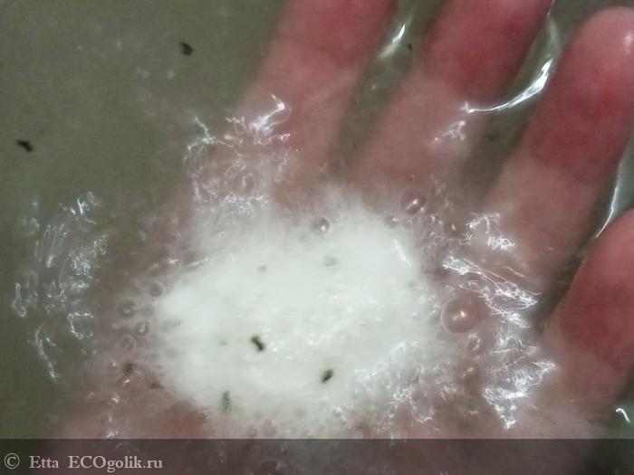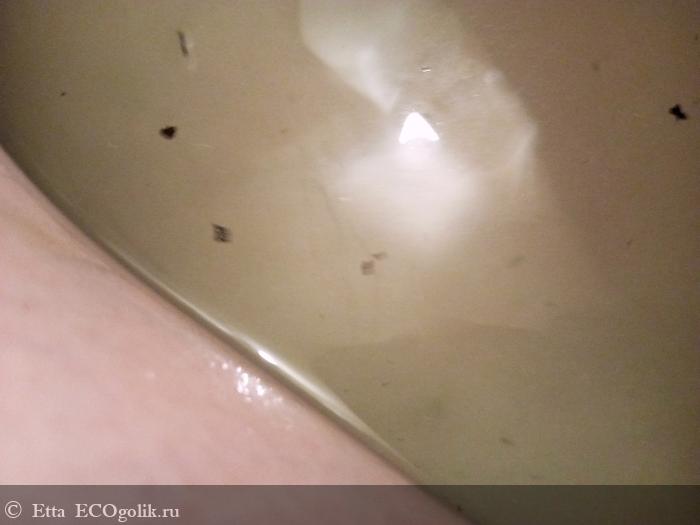 После растворения бомбочки на поверхности воды есть едва заметная маслянистость, не как было у кедровой бомбы, но масла достаточно для того, чтобы оно потом питало кожу, но не создавало жирной пленки на ней, и на поверхности ванны. Также в воде плавают кусочки мяты, которые мне напоминают чаинки в заварке, но при принятии ванны они не мешают, а после совершенно не забивают слив.