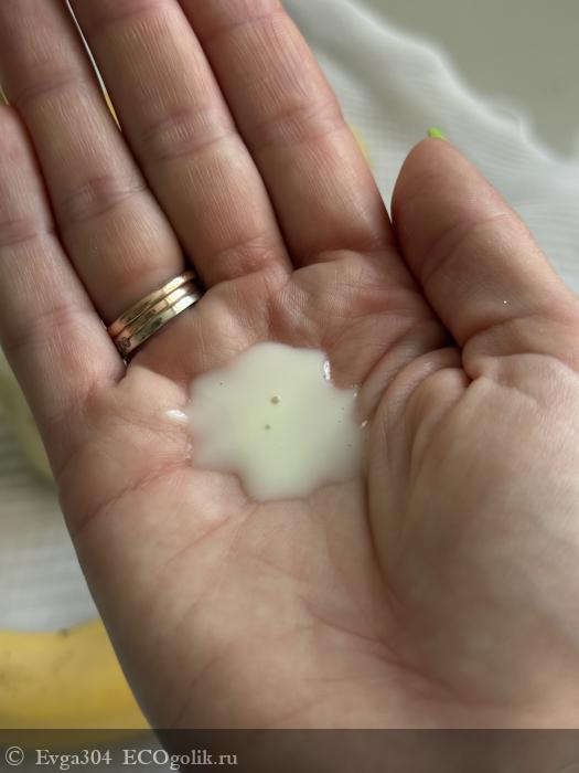 Продукт не густой, но и не совсем жидкий. Оттенок сливочно-банановый.