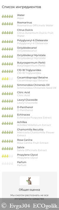 Aqua, Rosmarinus Officinalis (Rosemary) Water, Chamomilla Recutita (Matricaria) Flower Water, Citrus Aurantium Dulcis (Orange) Fruit Water, Polyglyceryl-6 Distearate, Octyldodecanol, Octyldodecyl Myristate, Butyrospermum Parkii, C10-18 Triglycerides, Cocamidopropyl Betaine, Litsea Cubeba Pers Oil, Simmondsia Chinensis Seed Oil, Citric Acid, Lauryl Glucoside, D-Panthenol, Echinacea Purpurea (Purple Coneflower) Extract, Achillea Millefolium (Common Yarrow) Extract, Matricaria Chamomilla Flower Extract, Rosa Canina Fruit Extract, Salvia Officinalis (Sage) Extract, Propylene Glycol, Parfum.